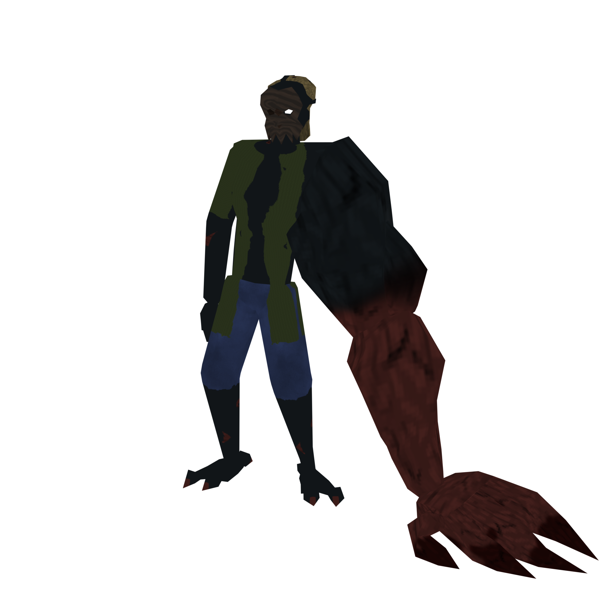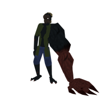 The last image presents Subject_2. He was a normal human subject before being corrupted by ERROR, and now wanders the dark corrupted forest alone, looking for companionship. I advise leaving him alone because his left arm is very big and you will be crushed. He is currently the tallest character in the game, clocking in about 3m in height